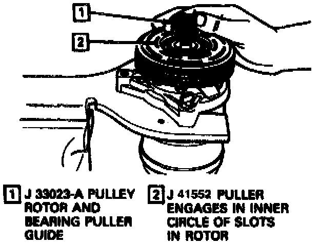 4. Hold the J 41552 puller in place and tighten the puller screw against the puller guide to remove the pulley rotor and bearing assembly.