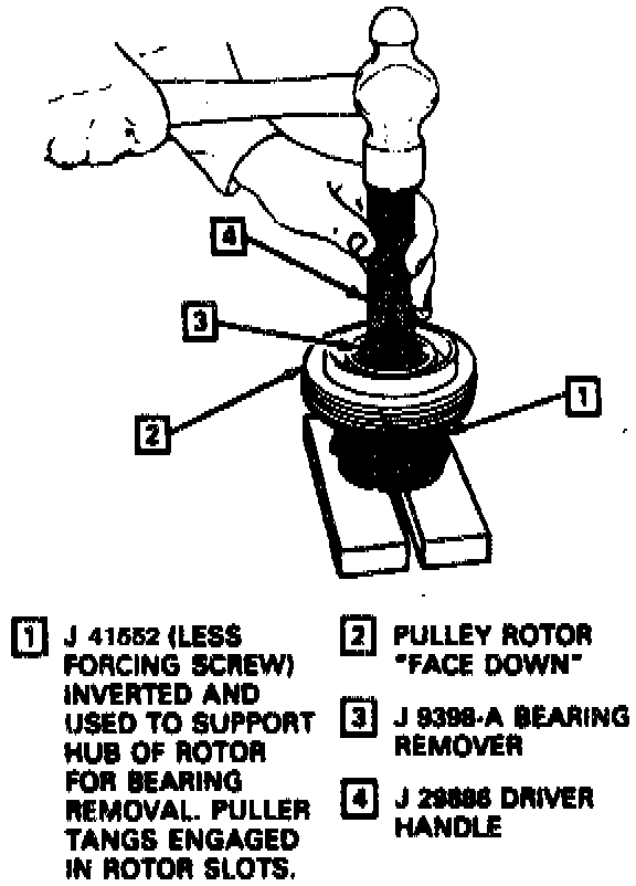 5. To prevent damage to the pulley rotor during bearing removal the rotor hub must be properly supported.