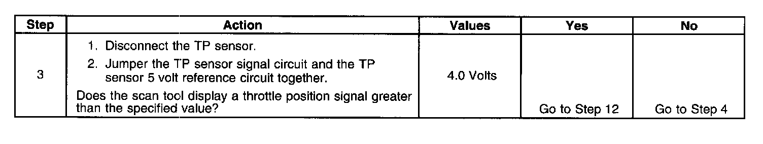 As shown, the Yes column in Step 3 should be "Go to Step 12". The circuit that is jumpered in Step 3 is the TP sensor signal circuit.