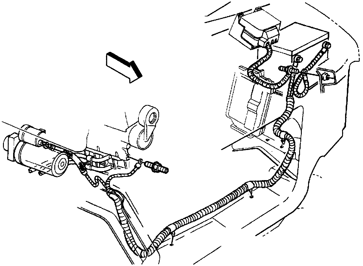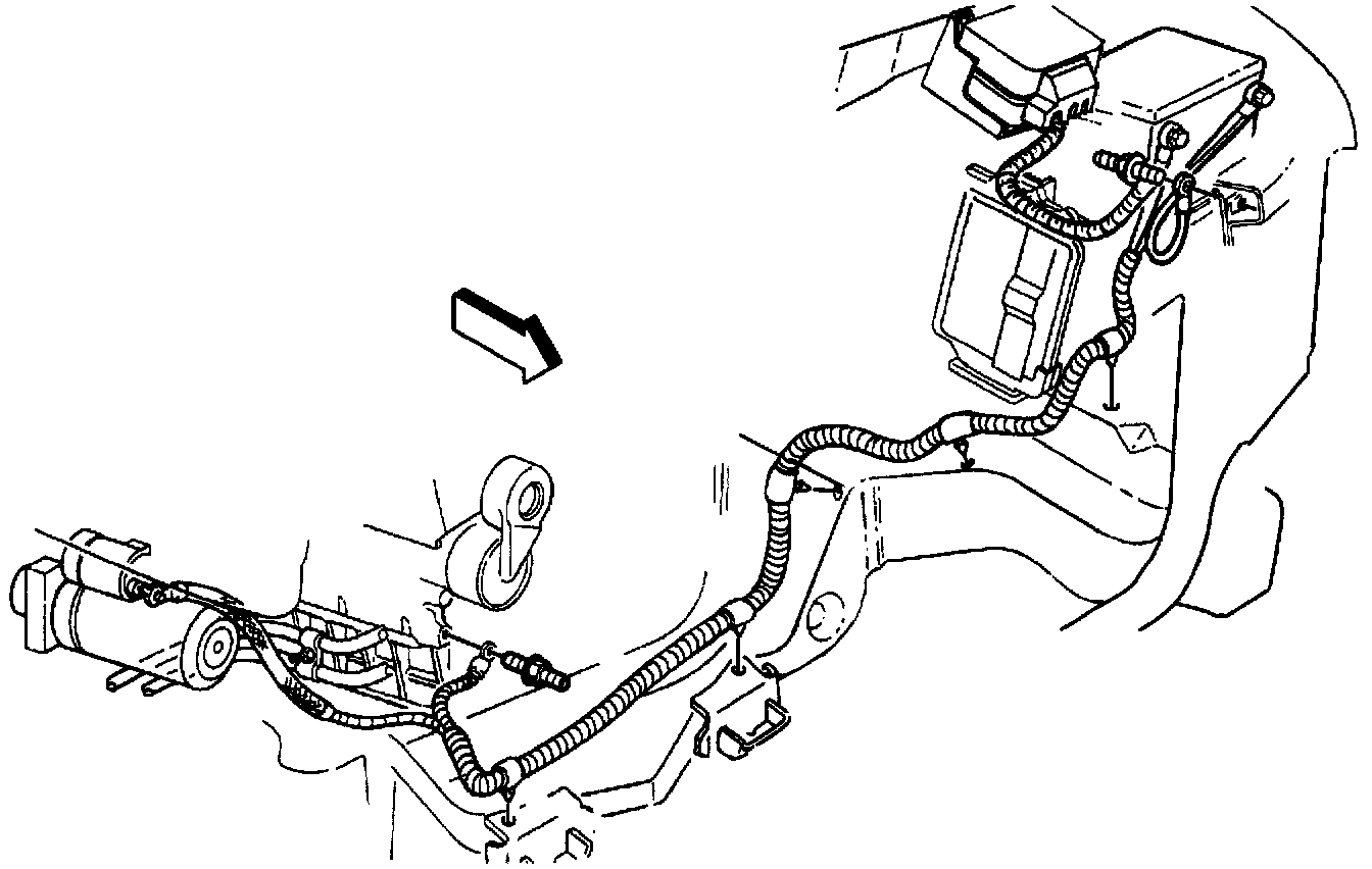 4. If the voltage drop in any of the above is more than 0.5 volt, there is excessive resistance in the circuit. To eliminate resistance, the cables should be disconnected and connections cleaned. If cables are frayed or the clamps corroded, the cables should be replaced. When selecting new cables, be sure they are the same length and diameter as the ones being replaced. Battery cable routing is shown.