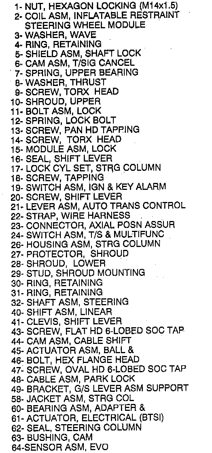 CAUTION: Always use the correct fastener In the proper location. When you replace a fastener, use ONLY the exact part number for that application. The manufacturer will call out those fasteners that require a replacement after removal. The manufacturer will also call out the fasteners that require thread lockers or thread sealant. UNLESS OTHERWISE SPECIFIED, do not use supplemental coatings (paints, greases, or other corrosion Inhibitors) on threaded fasteners or fastener pint Interfaces. Generally, such coatings adversely affect the fastener torque and pint clamping force, and may damage the fastener. When you install fasteners, use the correct tightening sequence and specifications. Following these Instructions can help you avoid damage to parts and systems. Failure to do so may result in component damage or malfunction of steering column.