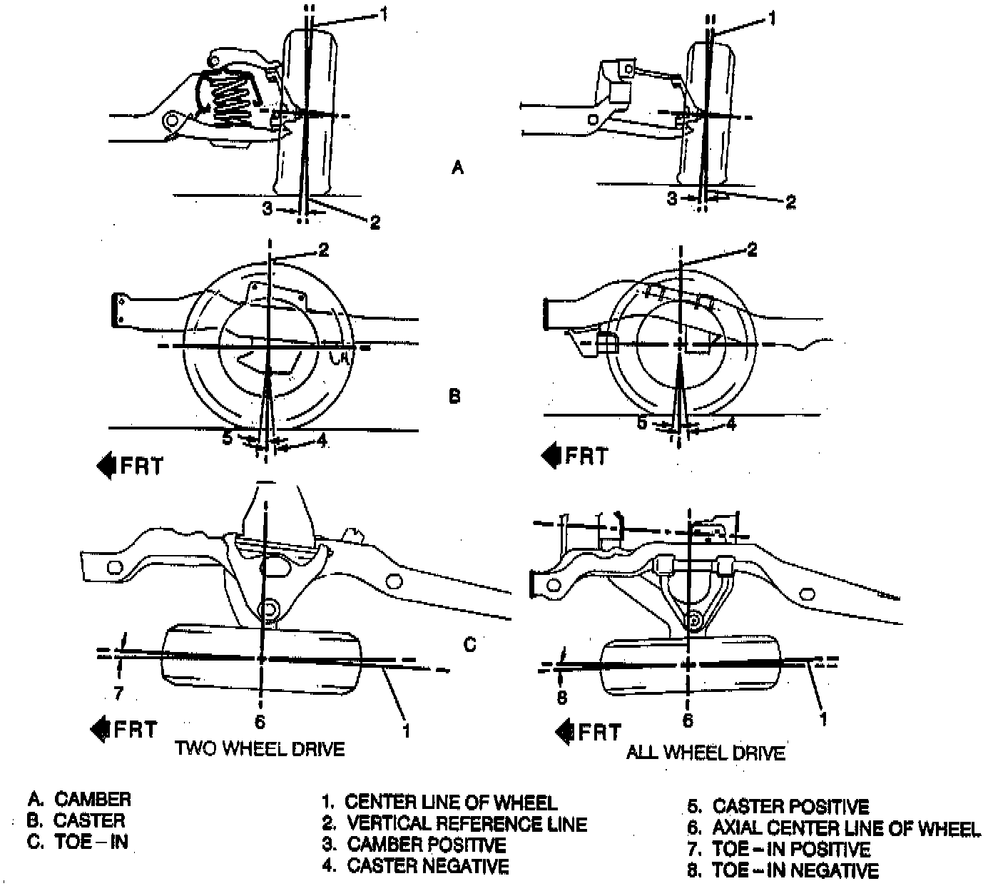 If camber is extreme or unequal between the wheels, improper steering and excessive tire wear will result. Negative camber causes wear on the inside edge of the tire, while positive camber causes wear to the outside.