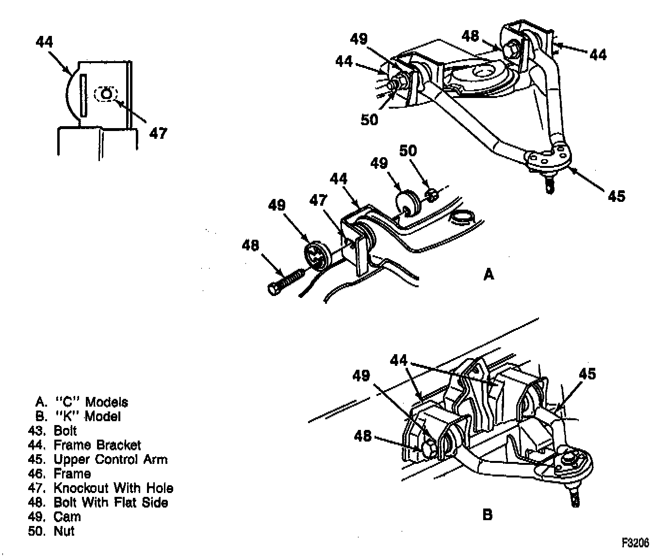 2. Bolts (48) and cams (49) through frame brackets (44), and control arm (45).