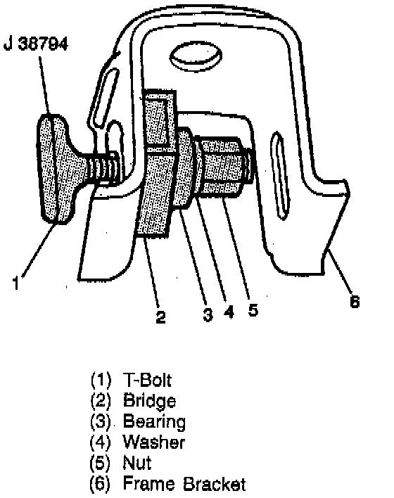 c. Install bridge onto T-bolt. The forward bracket requires the bridge to be installed between the legs of the bracket due to access problems.