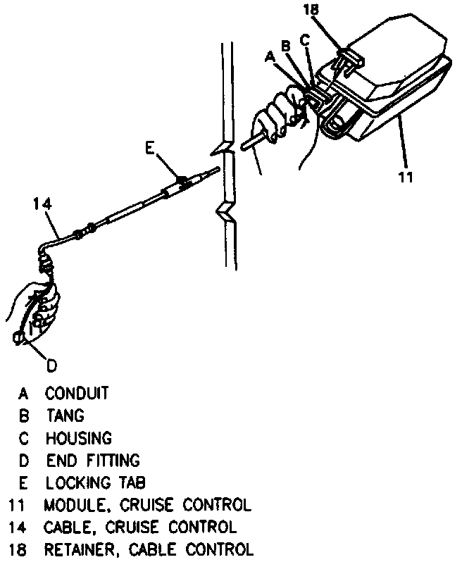 The cable (14) is connected between the cruise control module (11) and the throttle body lever, or accelerator control/cruise control servo cable adjuster, if equipped.
