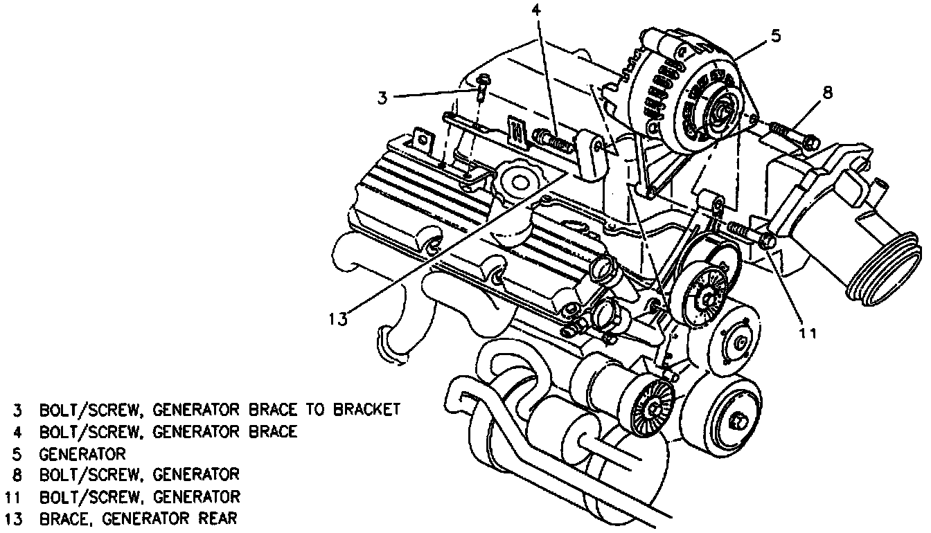 2. Generator bolts/screws (8 and 11) attaching generator (5) to drive belt tensioner.