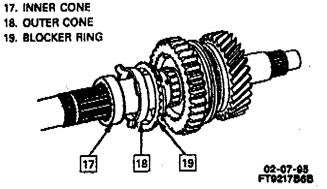 NOTICE: If replacing 1st/2nd or 3rd/4th synchronizer blocker rings, soak new blocker ring assemblies for 10 minutes in Dextron (tm)-III or equivalent before assembly on mainshaft.