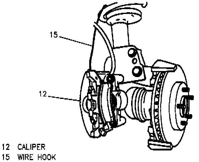 7. Caliper from rotor and knuckle. Do not let caliper hang from brake hose. Damage may occur. If the caliper assembly is not being removed from the vehicle for unit repair, suspend the caliper with a wire hook from the strut. Inspect mounting bolts and sleeve assemblies for corrosion. Bushings for cuts or nicks. If damage to either part is found, replace with new parts when installing caliper. Do not attempt to polish away corrosion.