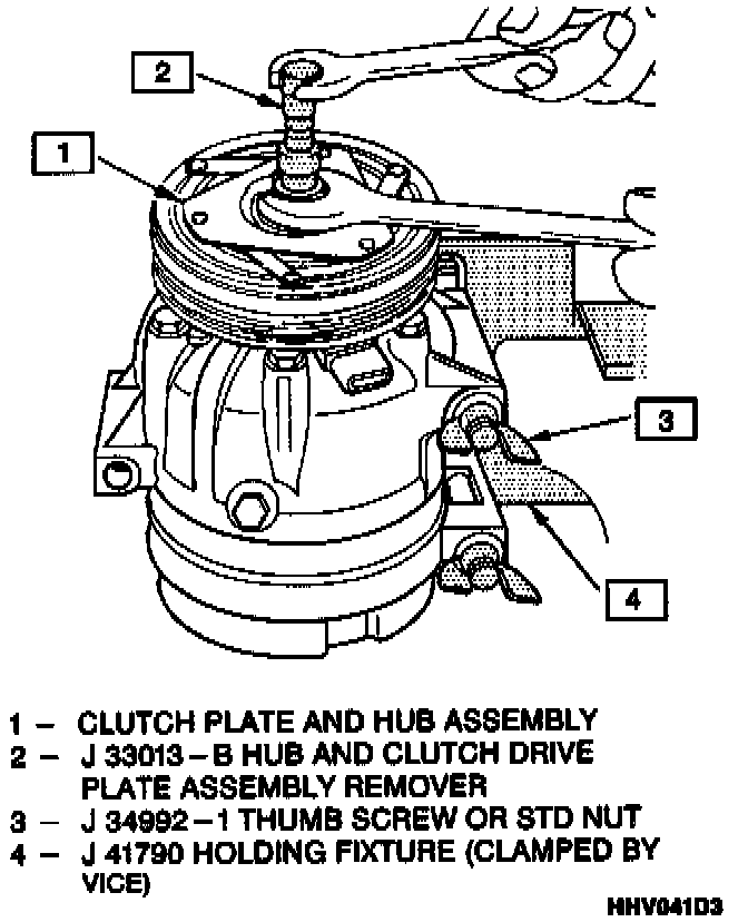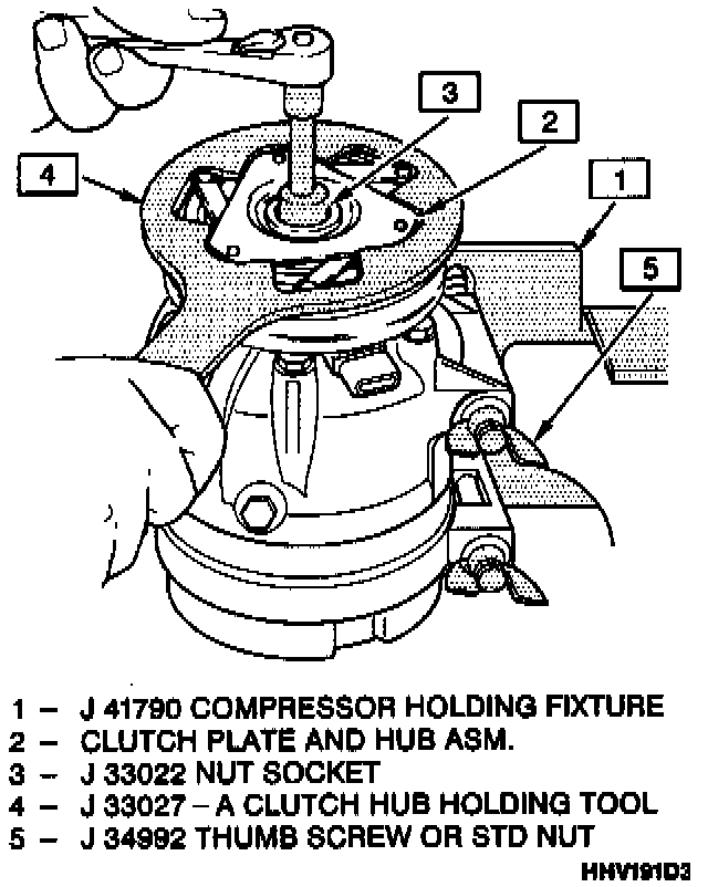 1. Clamp the holding fixture J 41790 in a vise and attach compressor to holding fixture with nuts and bolts (2).