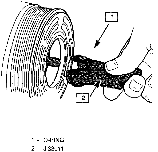 2. Insert the O-ring installer J 33011 into the compressor neck until the installer "bottoms." Lower the moveable slide of the O-ring installer to release the O-ring into the seal O-ring lower groove. (The compressor neck top groove is for the shaft seal retainer ring.) Rotate the installer to seat the O-ring and remove the installer.