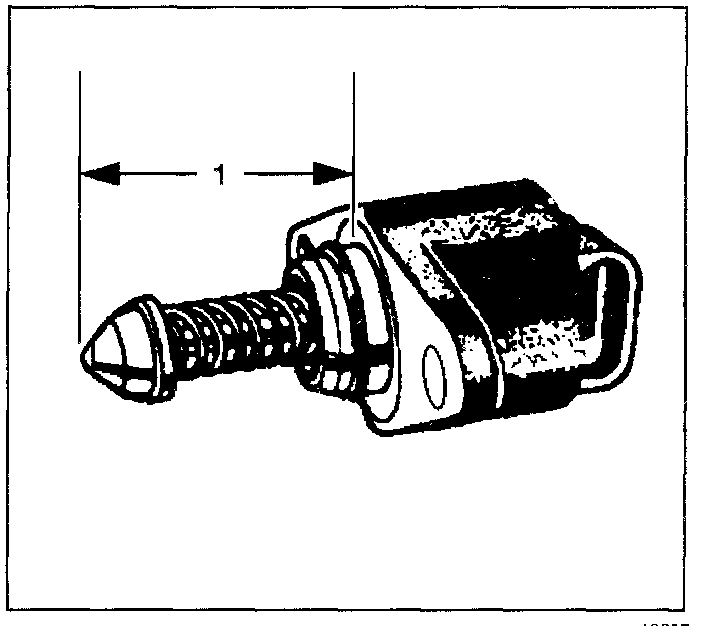 6. Measure the distance between the tip of the IAC valve pintle and mounting flange (1). Whenever the distance is greater than 28 mm, use finger pressure in order to slowly retract the pintle. The force required to retract the pintle of a new valve will not cause damage to the valve.