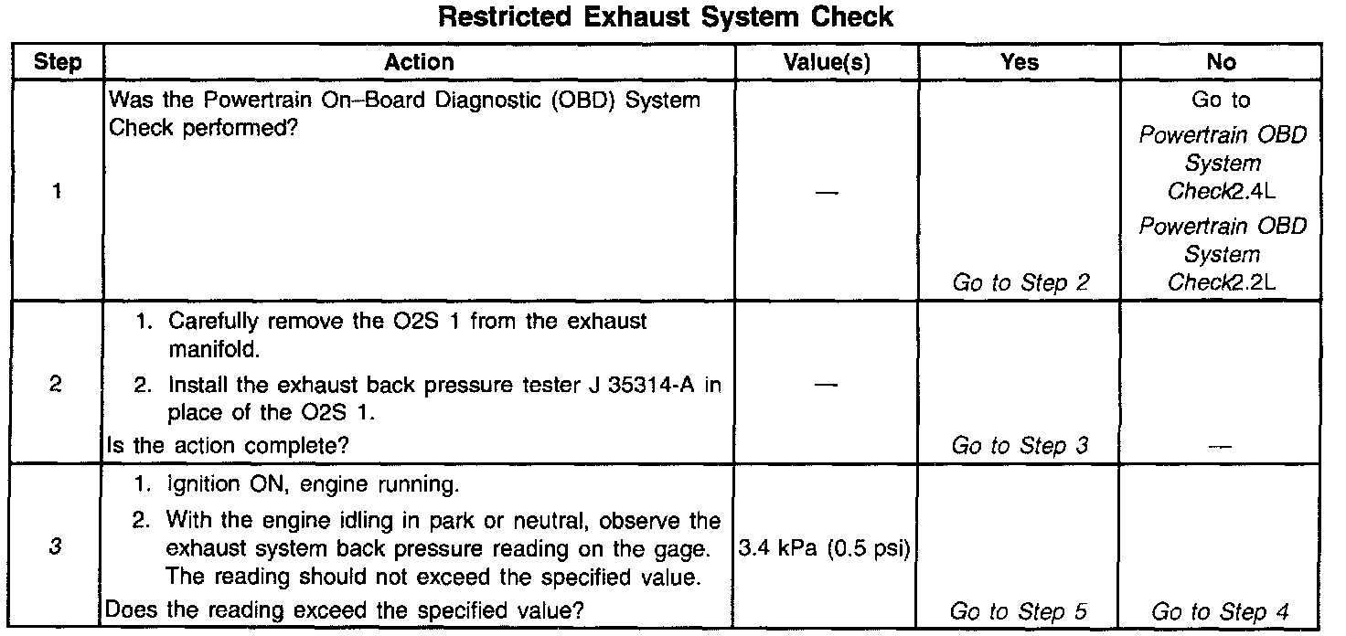 Proper diagnosis for a restricted exhaust system is essential before any components are replaced. Using the Restricted Exhaust System Check table should determine if the exhaust system is restricted. The best place for checking the exhaust system is at the O2S 1 location. Once the test is completed, coat threads with anti-seize compound P/N 5613695 or equivalent prior to 02S re-installation.