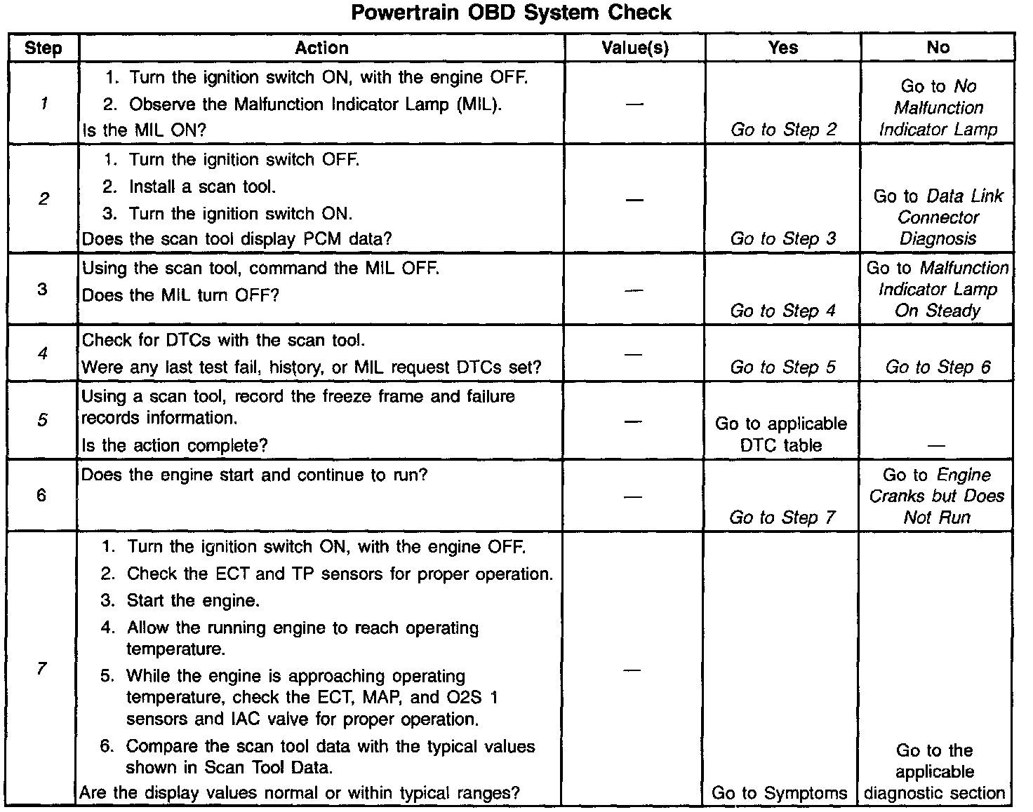 The Powertrain OBD System Check is an organized approach to identifying a problem created by an electronic engine control system malfunction. The Powertrain OBD system check is the starting point for any driveability complaint diagnosis. This directs the service technician to the next logical step in diagnosing the complaint. Do not perform this check if no driveability complaint exists. Understanding the table and using it correctly will reduce diagnostic time, and prevent the replacement of good parts.