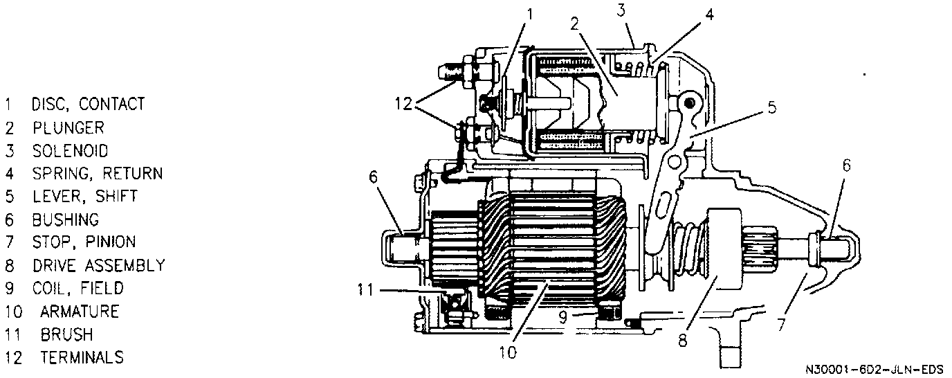 During starter operation, the solenoid windings are energized when the ignition switch is turned to the "START" position. The resulting plunger and shift lever movement causes the pinion to engage the engine flywheel ring gear and the solenoid main contacts to close, and cranking takes place.