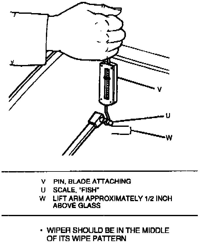3. Attach a scale (V) to wiper arm attaching pin (U) and measure the force required to lift wiper arm perpendicular to windshield to normal working height (height with blade assembly attached).