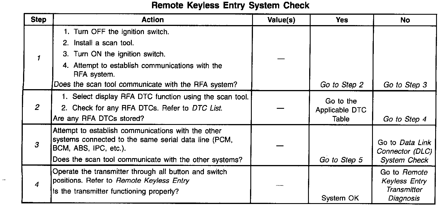 The Remote Keyless Entry Diagnostic System Check is an organized approach to identify problems associated with the Remote Function Actuation (RFA) system. This check must be the starting point for any RFA complaint, and will direct you to the next logical step in diagnosing the complaint. The RFA system and the Tire Pressure Monitor (TPM) system use the same receiver. Therefore, when a TPM system malfunction occurs, all diagnostic information (DTCs, input data, etc.) must be accessed through the RFA system. Understanding the RFA/TPM system and using the tables correctly will reduce diagnostic time and prevent unnecessary parts replacement.