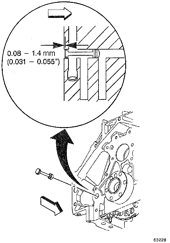 13. Install the block rear oil gallery plug into the oil gallery bore 0.8-1.4 mm (0.0315-0.055 inch) below flush.