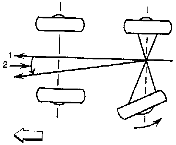 The front wheels aim or steer the vehicle. The rear wheels control tracking. The tracking action is relative to the thrust angle (2). Thrust angle (2) is defined as the path that the rear wheels will take. The thrust angle (2) should be aligned with the body centerline (1).