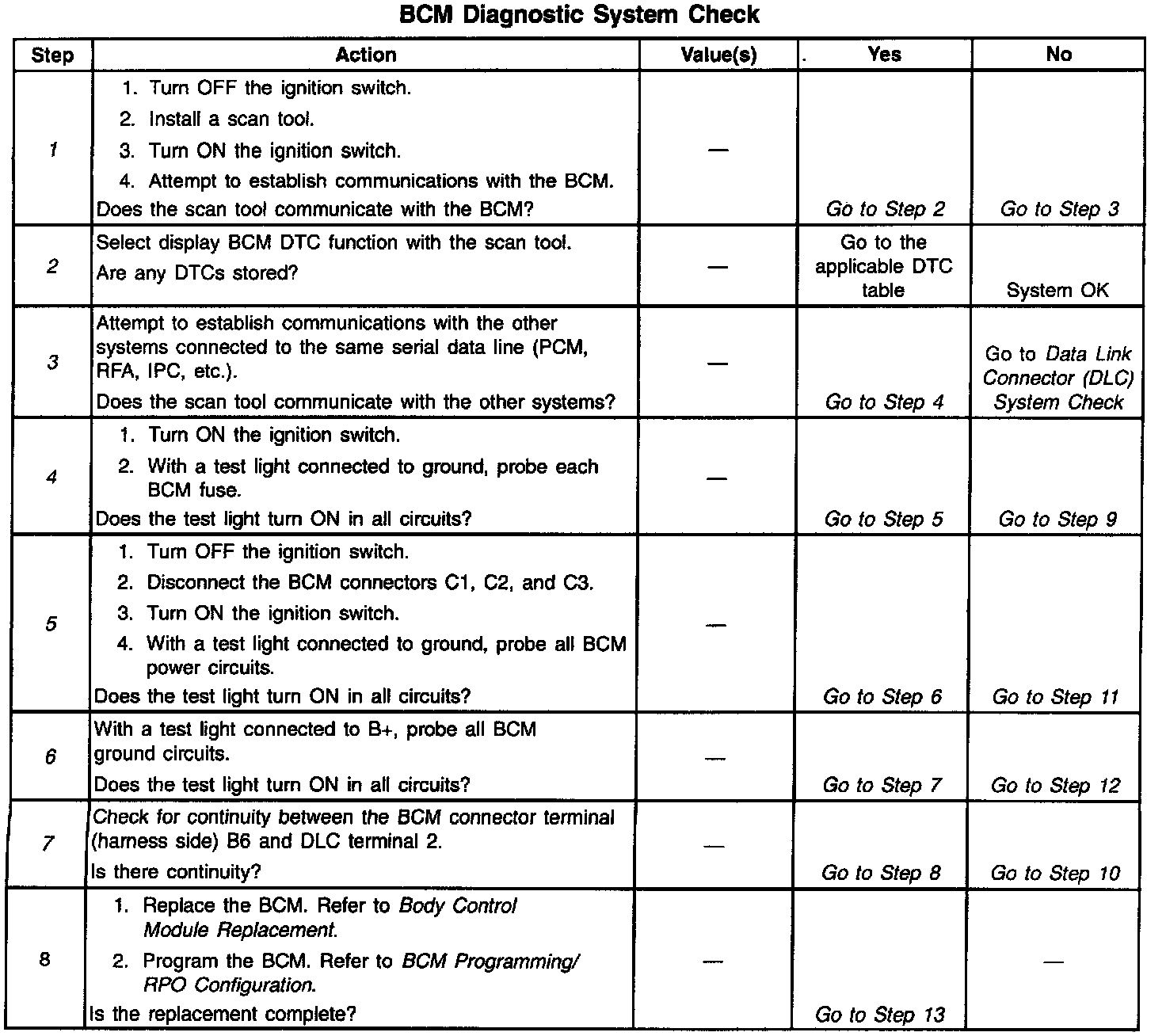 The Body Control Module (BCM) Diagnostic Check is an organized approach to identify problems associated with the BCM. This check must be the starting point for any BCM complaint, and will direct you to the next logical step in diagnosing the complaint. The BCM is a very reliable component and is not likely the cause of the malfunction. Most system complaints are linked to faulty wiring and connectors, and occasionally to components. Understanding the computer system and using the tables correctly will reduce diagnostic time and prevent unnecessary parts replacement.