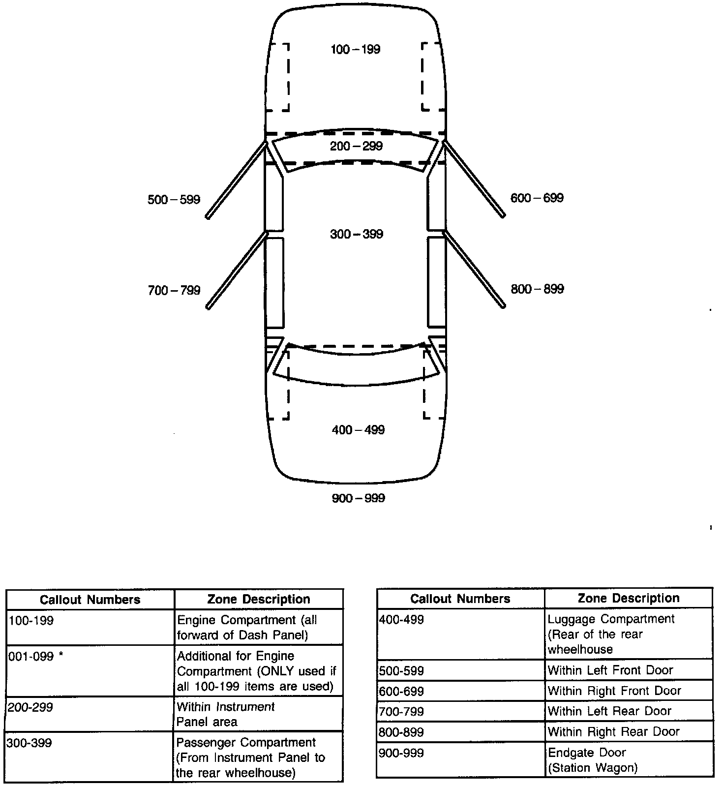 All grounds, in-line connectors, pass-through grommets, and splices are given identifying numbers according to where they are located in the vehicle. The above table explains the numbering system.