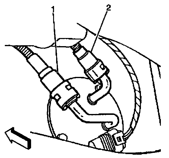 10. Connect the fuel sender fuel feed pipe (1) (jet pump to left tank) and the fuel feed rear crossover pipe (2) (left tank to jet pump). Refer to Quick Connect Fittings (Plastic Collar).