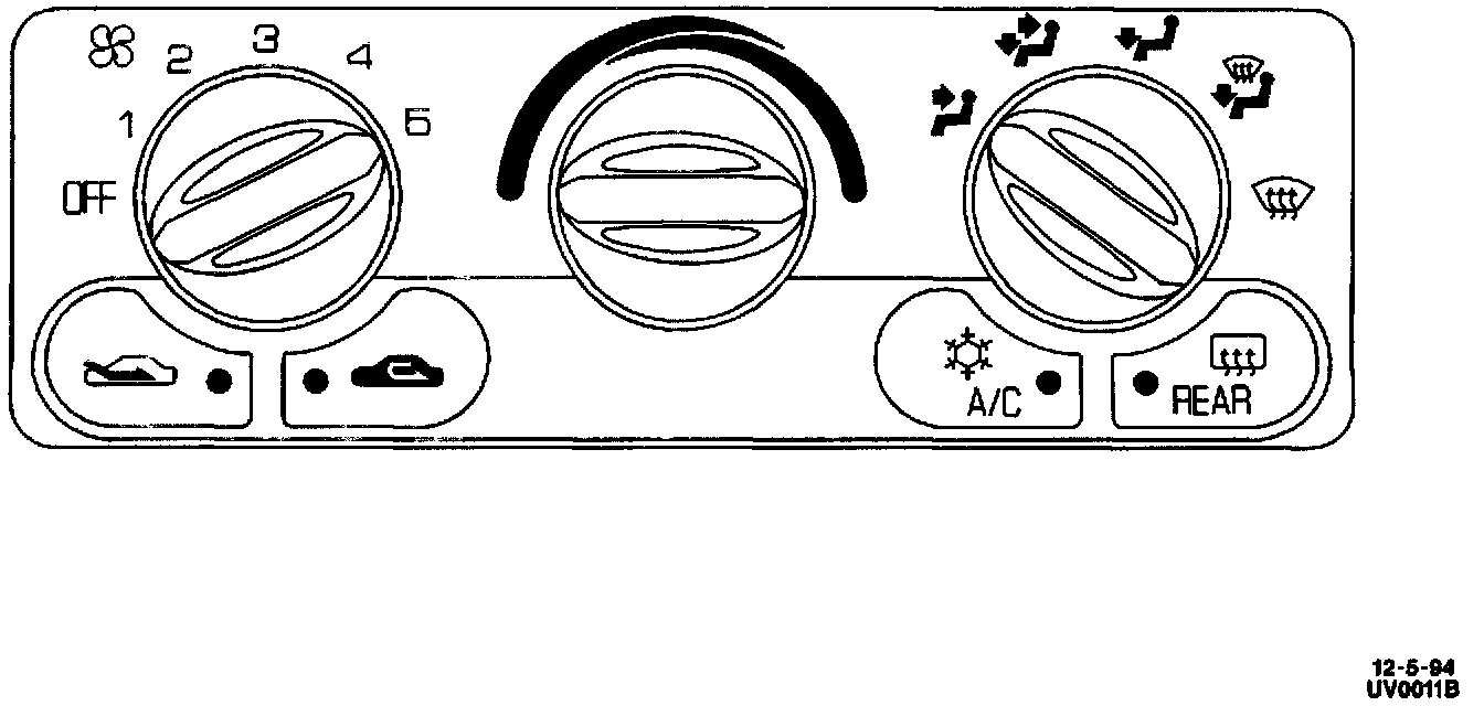 The operation of the A/C system is controlled by knobs and buttons on the control head. The compressor clutch and blower are connected electrically to the control head by a wiring harness. Air flow is provided by the five blower speeds available. Cooled and dehumidified air is available in all modes. A/C compressor operation is forced in defog and defrost modes and is available in remaining modes by pushing A/C button-to-light indicator above button. Low ambient temperatures will permit operation of A/C compressor.