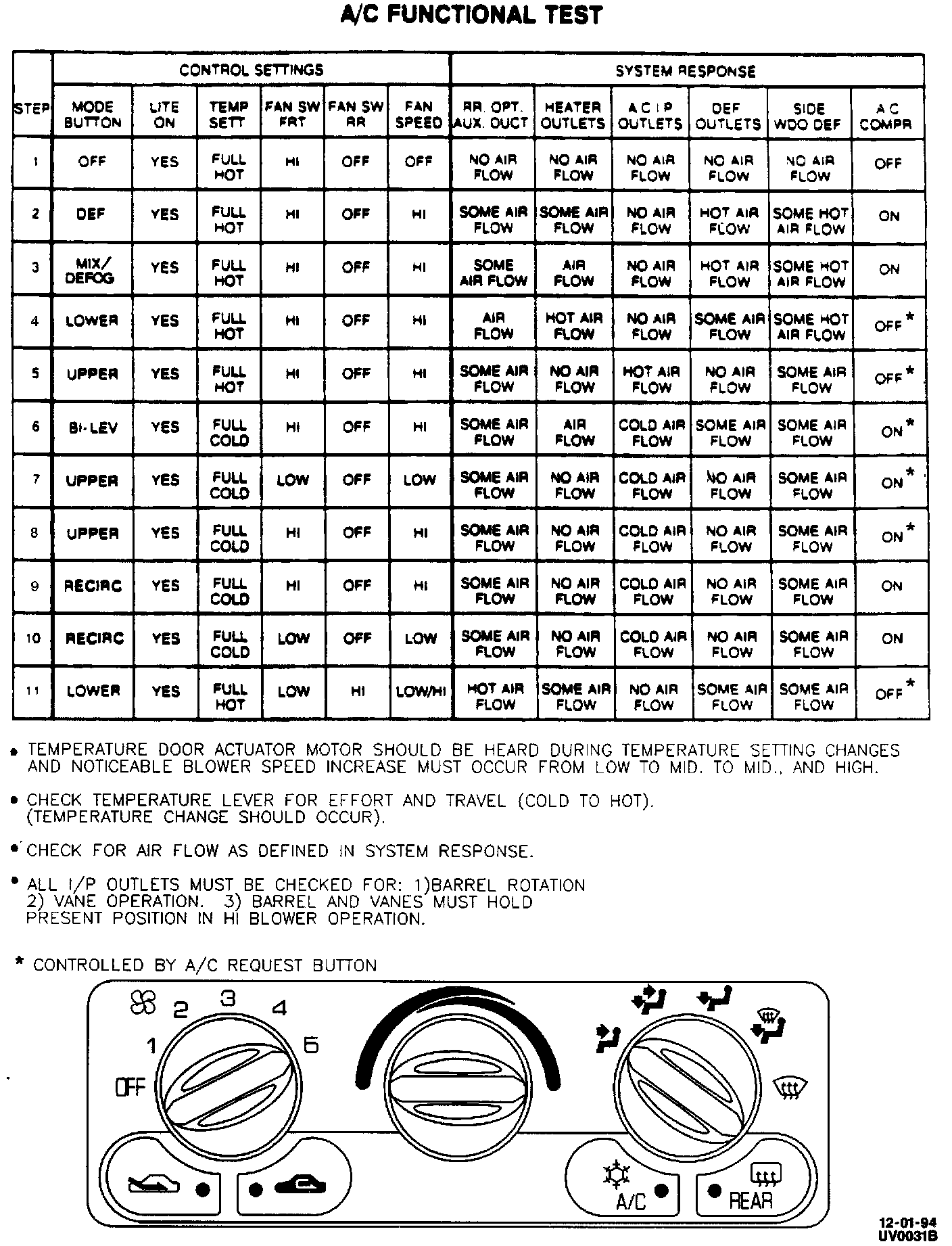 1. Operation of the air conditioning blower at any speed with the mode in any position except OFF" and engagement of the compressor clutch would indicate that the electrical circuits are functioning properly. The blower will not operate in any speed with the mode button in the "OFF" position. For "Rear A/C Function Test" compare vehicle response to the normal system response shown in the chart. If the vehicle does not respond correctly during any of these steps, begin diagnosis as noted below: