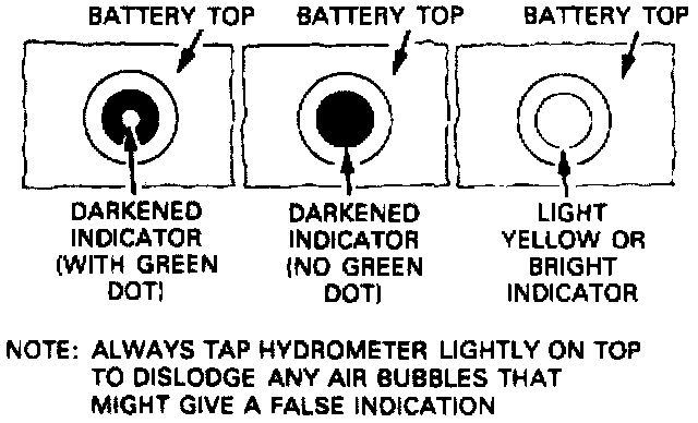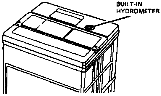 The sealed battery has a built-in temperature-compensated hydrometer (also known as "test indicator," "state of charge indicator," "dot," or "eye") in the top of the battery. Built-in hydrometers provide a "go/no go" indication of the battery state of charge, based on the specific gravity of the electrolyte. Use the hydrometer with the following diagnostic procedure.