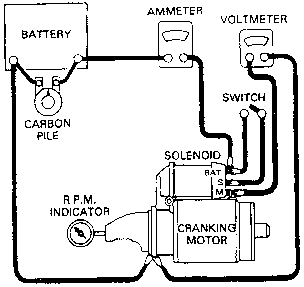 ^ Pinion moves into cranking position but does not turn, and very low current draw indicate an open in the brushes or armature windings, or no current flow between the solenoid battery and motor field terminals while the motor is engaged. Add a jumper lead between the solenoid battery and motor field "M" terminals. If the motor now turns at the specified RPM, the starter solenoid is inoperative.