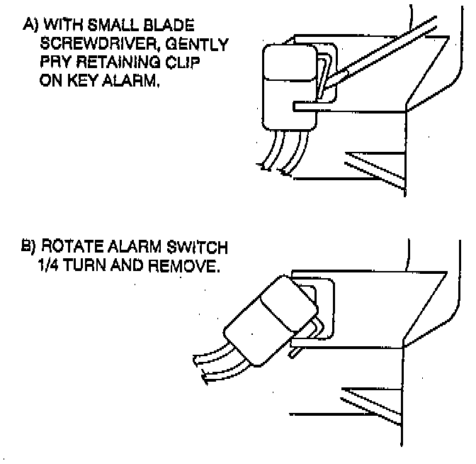 ^ Gently pry retaining clip on alarm switch with small blade screwdriver.