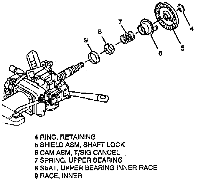 ^ Insert small blade screwdriver into slot in lock module assembly (15). Push against locking tab on end of cable assembly (48) and remove.