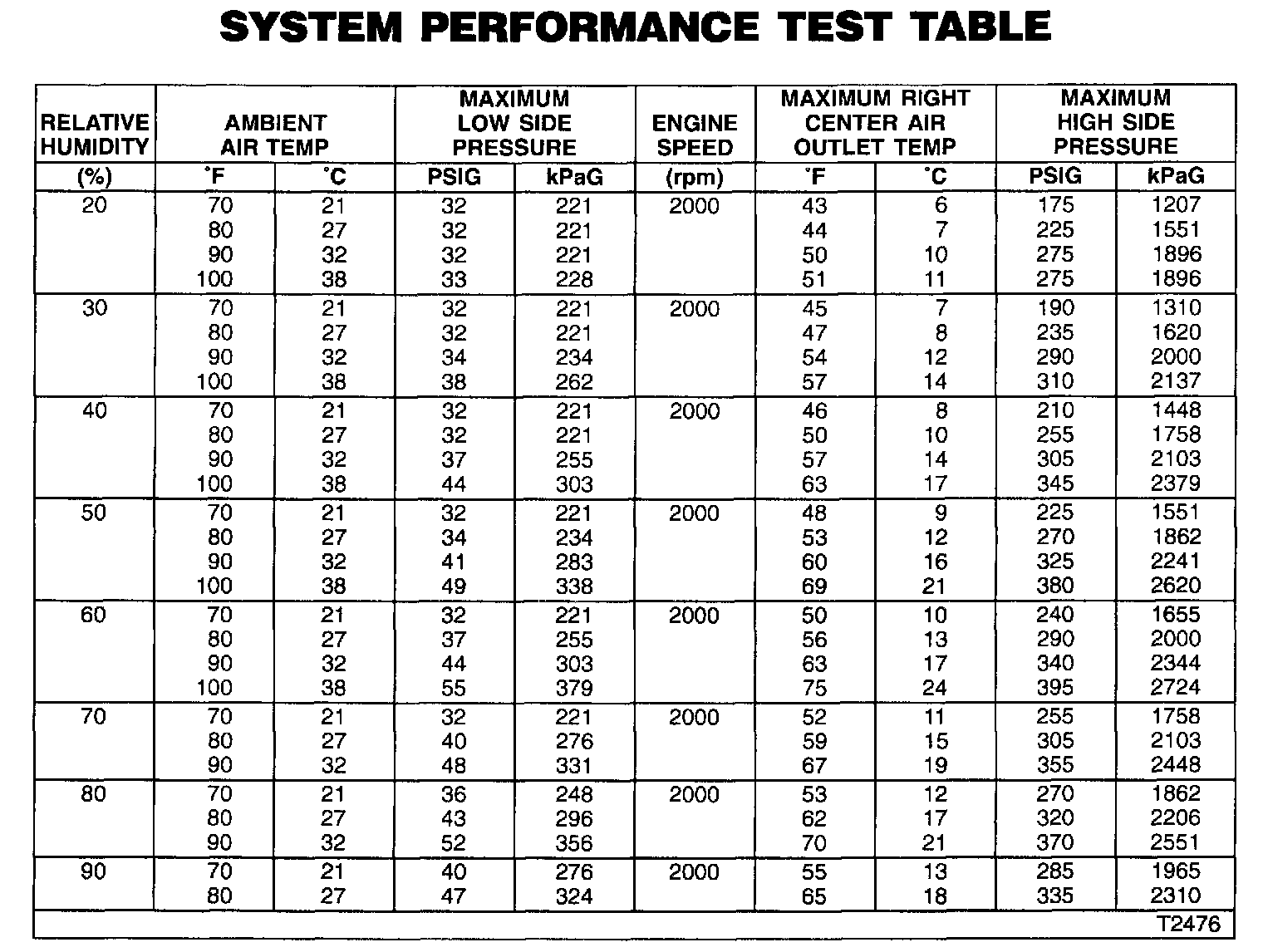 16. Turn the engine off and compare the readings. Normally operating air conditioning systems should not exceed the levels shown on the Pressure Temperature Relationship and System Performance Test tables.