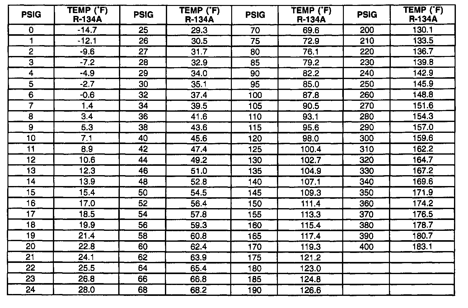 Pressure/Temperature Relationship Table: