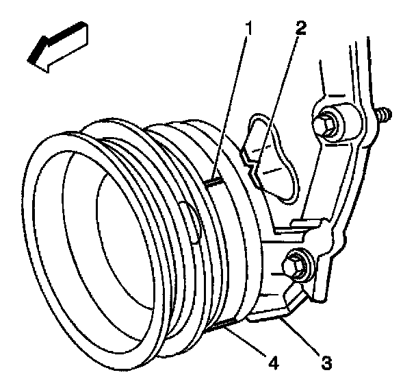 8. Rotate the crankshaft balancer to position the crankshaft balancer alignment mark (1) 57-63 degrees clockwise or counterclockwise from the engine front cover alignment tab (2).