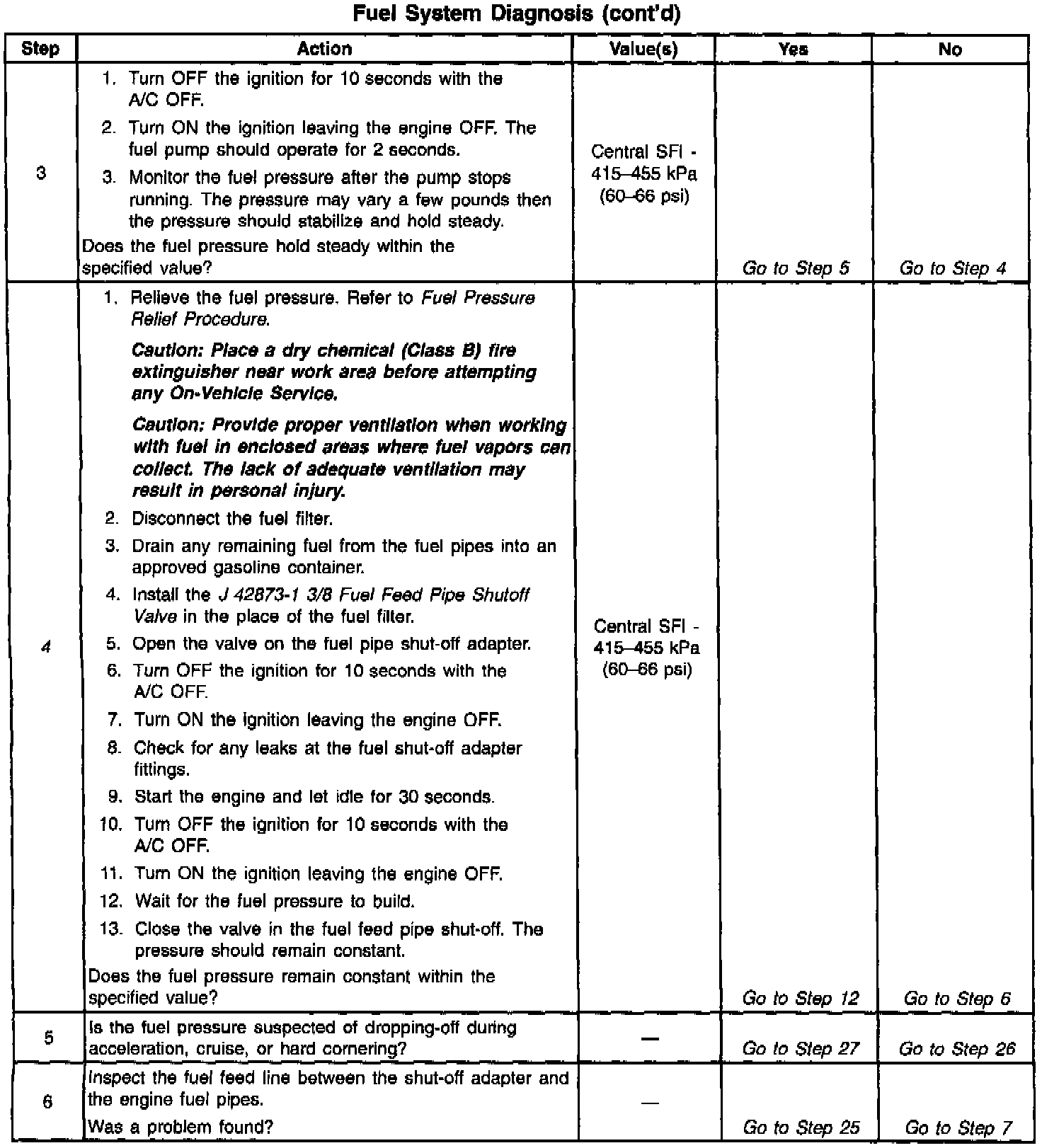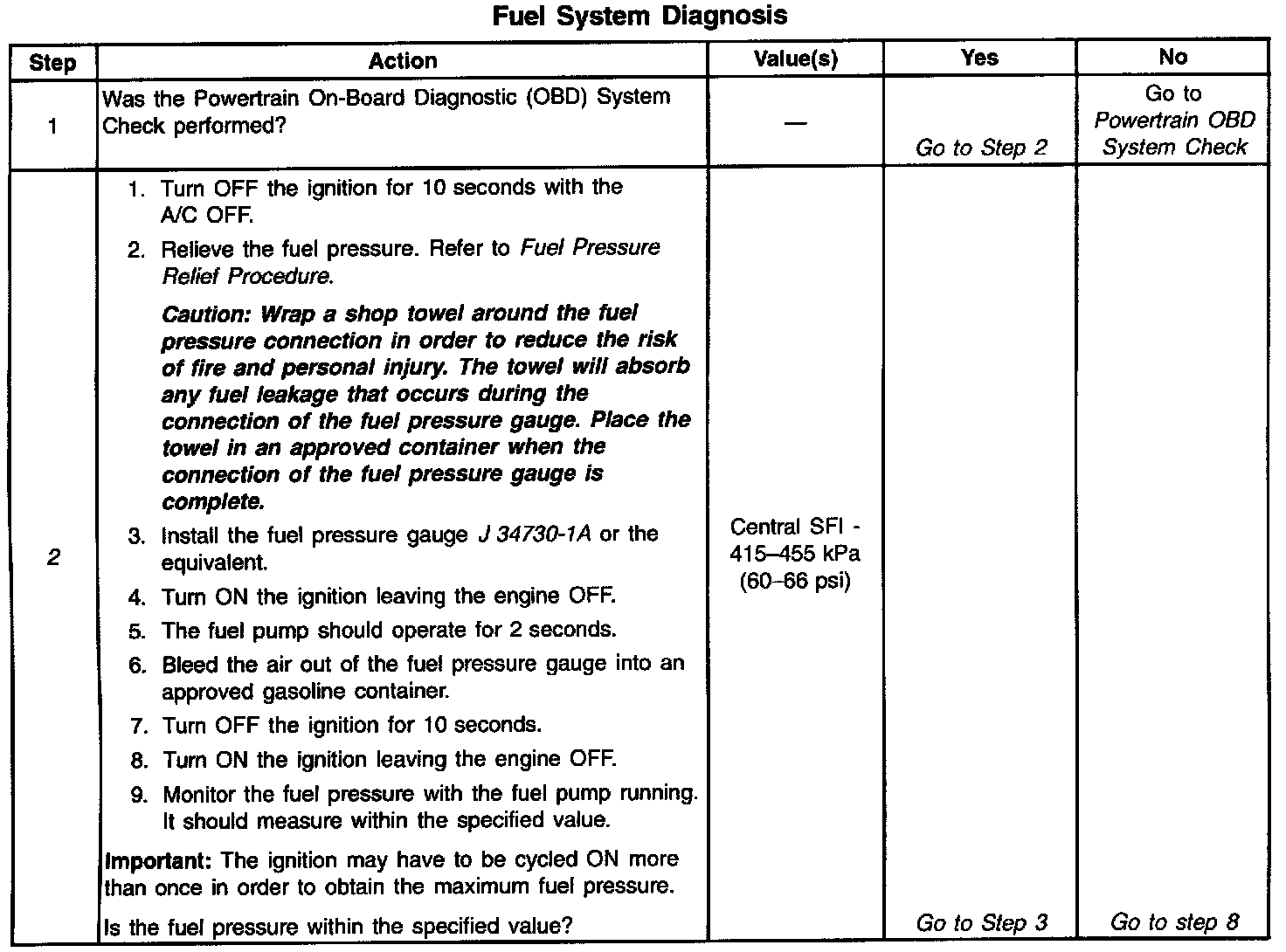 ^ The pressure is regulated but less than 415 kPa (60 psi).The amount of fuel reaching the injector is sufficient, but the pressure is too low. The system will run lean, hard starting cold, no start, overall poor performance, and may set a DTC. Refer to Engine Cranks but Does Not Run. Engine Cranks, But Will Not Run