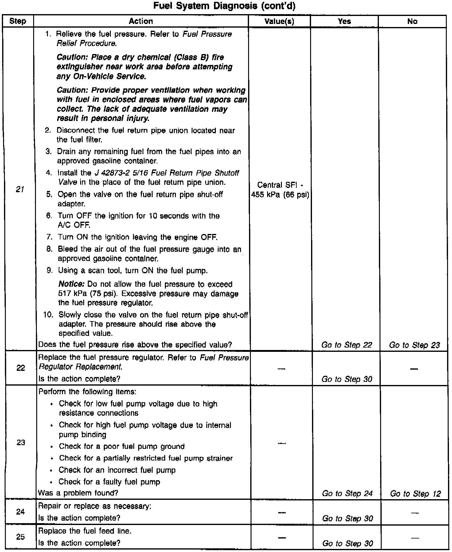 21. Restricting the fuel return line allows the fuel pressure to build above regulated pressure. With the battery voltage applied to the fuel pump test terminal, the pressure should rise above 455 kPa (66 psi), as the valve in the return line is partially closed.