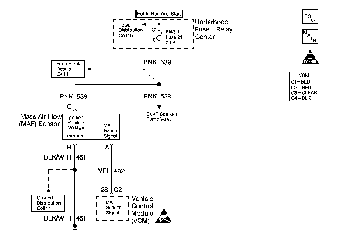 - A damaged harness. Inspect the wiring harness for damage. If the harness appears to be OK, observe the scan tool while moving connectors and wiring harnesses related to the MAF sensor. A change in the display will indicate the location of the malfunction.
