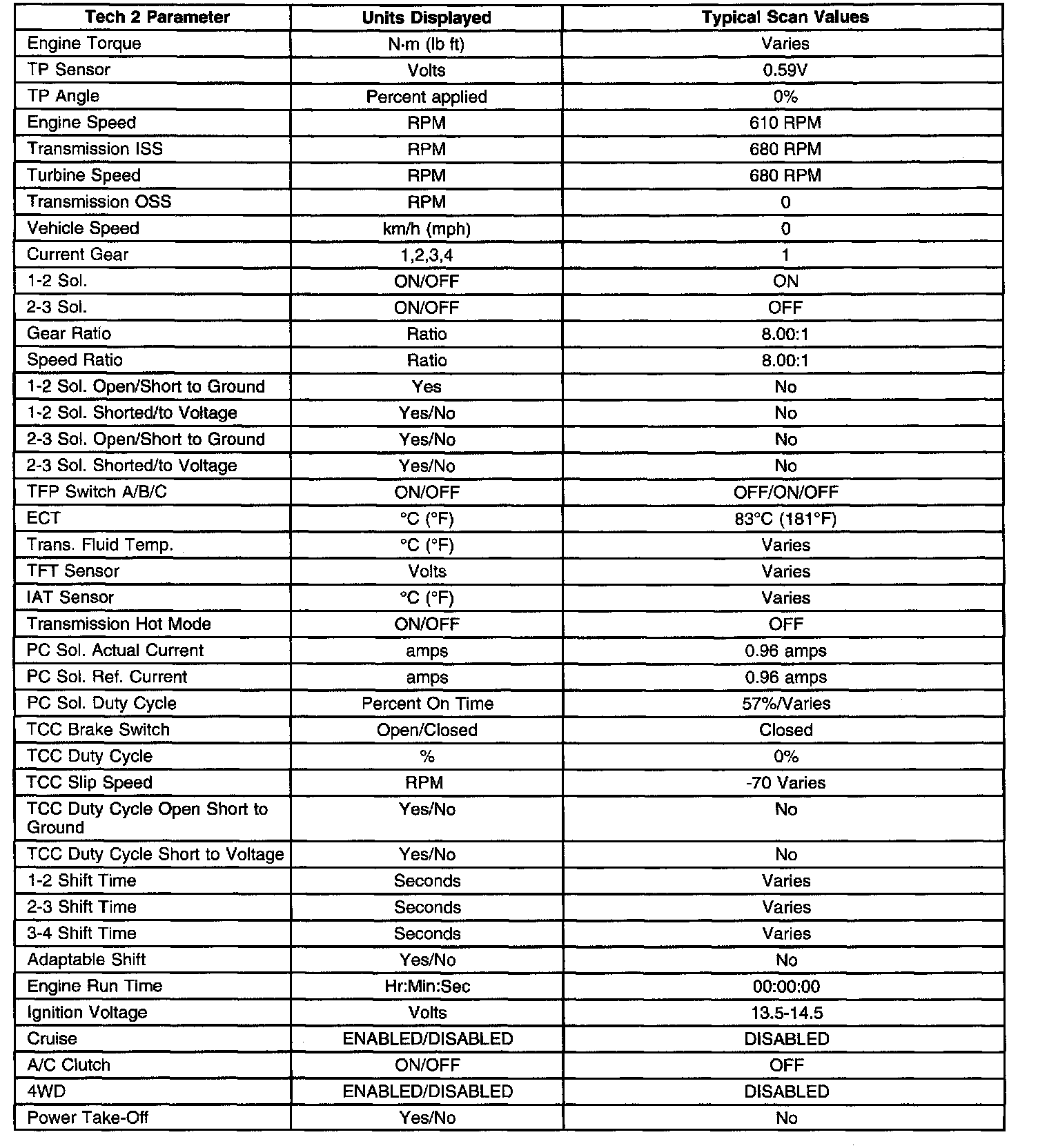 Only the parameters listed below are used in this manual for diagnosing. If a scan tool displays other parameters, the values are not recommended by General Motors for use in diagnosis.