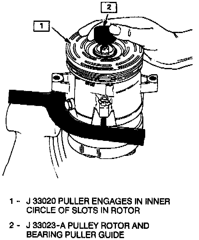 4. Hold the J 33020 pulley in place and tighten the pulley screw against the pulley guide to remove the pulley rotor and bearing assembly.