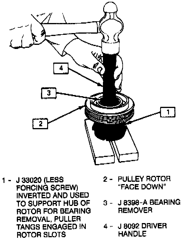 5. To prevent damage to the pulley rotor during bearing removal the rotor hub must be properly supported.