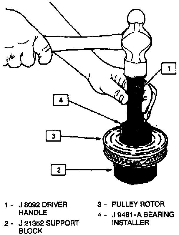 1. Place the pulley rotor on the J 21352-A support block to fully support the rotor hub during bearing installation.