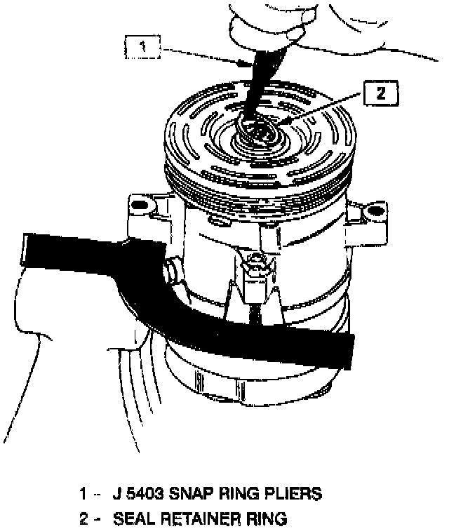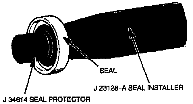 4. Install the new seal retainer ring with its flat side against the seal, using snap-ring pliers J 5403. Use the sleeve from O-ring installer J 33011 to press in on the seal retainer ring so that it snaps into its groove.