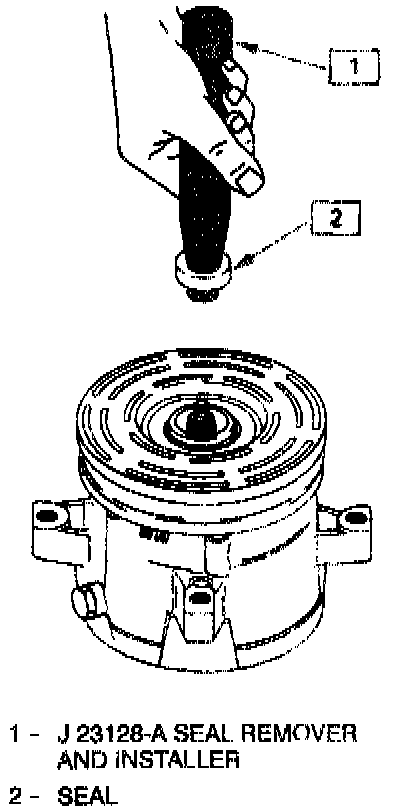 6. Fully engage the knurled tangs of seal remover-installer J 23128--A into the recessed portion of the seal by turning the handle clockwise. Remove the seal from the compressor with a rotary-pulling motion. Discard the seal. The handle should be hand-tightened securely. Do not use a wrench or pliers.