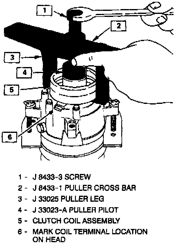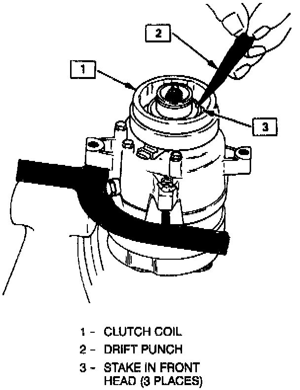1. Perform Steps 1 through 4 of "Clutch Rotor and/or Bearings" removal procedure. Mark clutch coil terminal location on compressor front head.