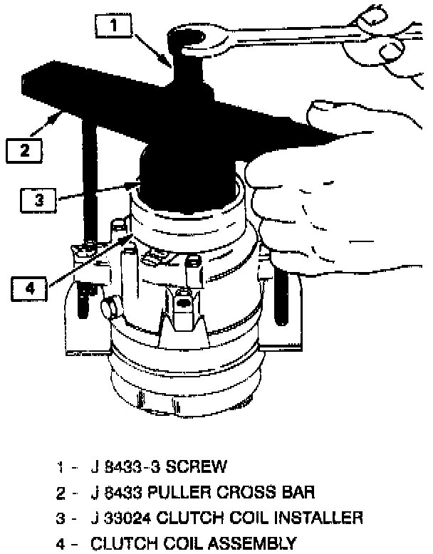 4. Turn the center forcing screw of the J 8433-1 pulley crossbar to force the clutch coil onto the front head. Be sure clutch coil and J 33024 installer stay "in-line" during installation.
