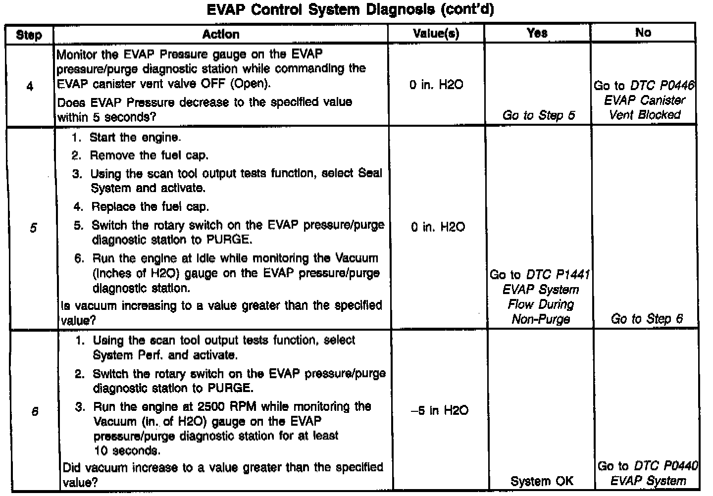 A stuck closed EVAP purge solenoid, stuck open EVAP vent solenoid, disconnected or damaged EVAP purge line or vent hose, leaking fuel cap, or fill neck should set a DTC P0440. A small leak in the EVAP system should set a DTC P0442. An EVAP vent solenoid stuck closed, a restricted vent hose, or a blocked EVAP canister should set a DTC P0446. A continuous purge condition with no purge commanded by the PCM (EVAP purge solenoid stuck open or leaking) should set a DTC P1441. Refer to the DTC tables for further diagnostic procedures regarding the EVAP system. Testing and Inspection