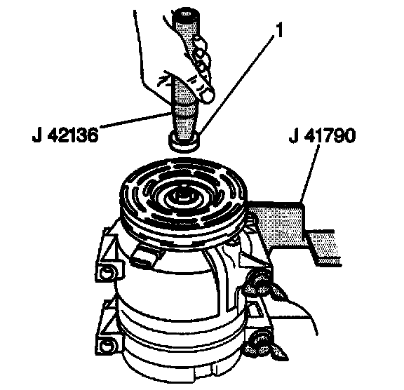 1. Dip the new compressor shaft seal (1) in clean 525 viscosity refrigerant oil and assemble the seal onto the J 42136 by turning the handle clockwise.