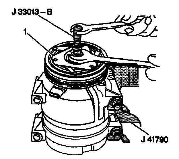 2. Keep the clutch hub and drive plate assembly from turning by using the clutch hub holding tool J 33027-A. Remove the compressor shaft nut using a 13 mm socket (1) (Figure 2).