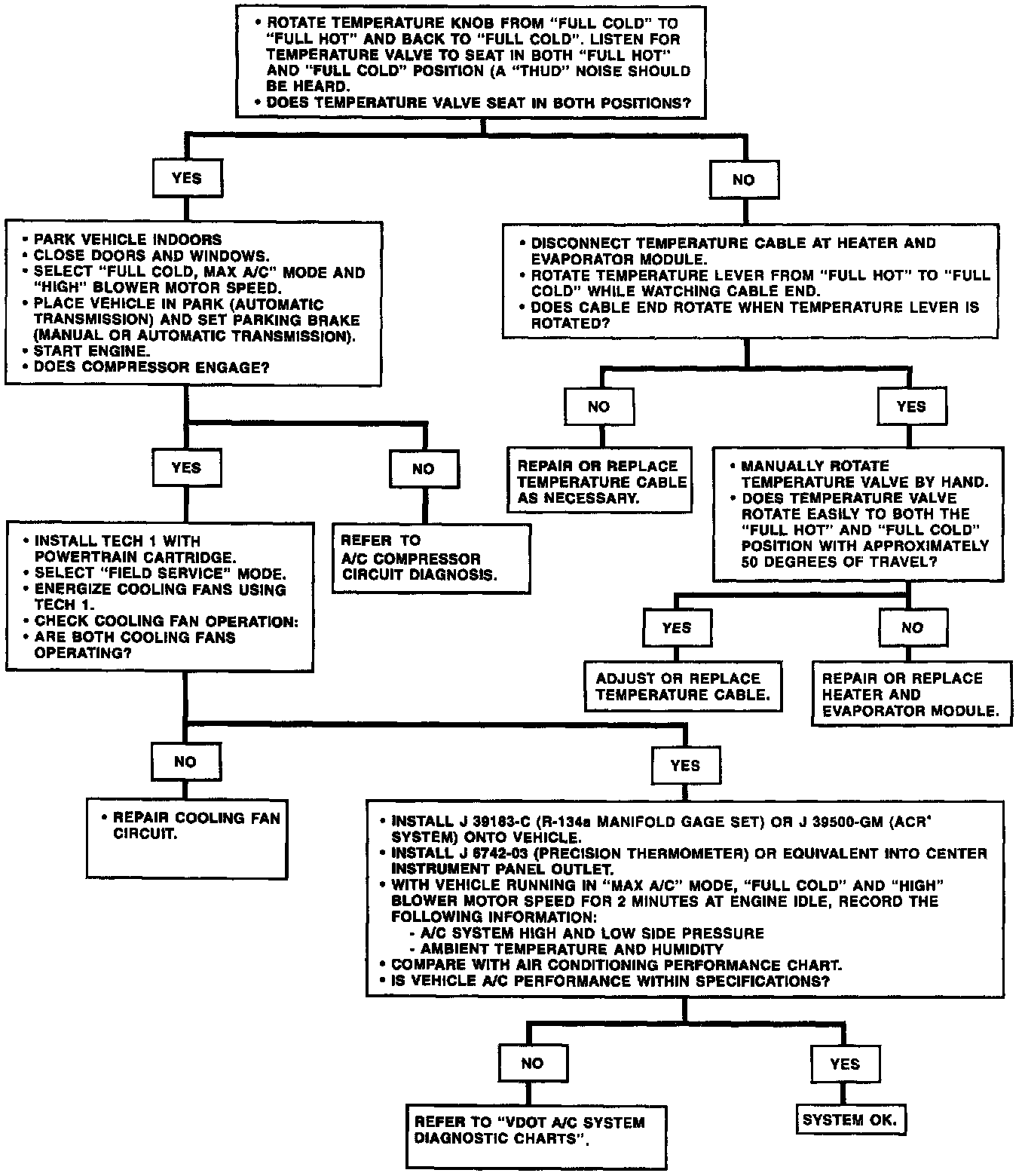 If system performance is not within specifications, proceed to the Air Conditioning Diagnostic Charts. Testing and Inspection