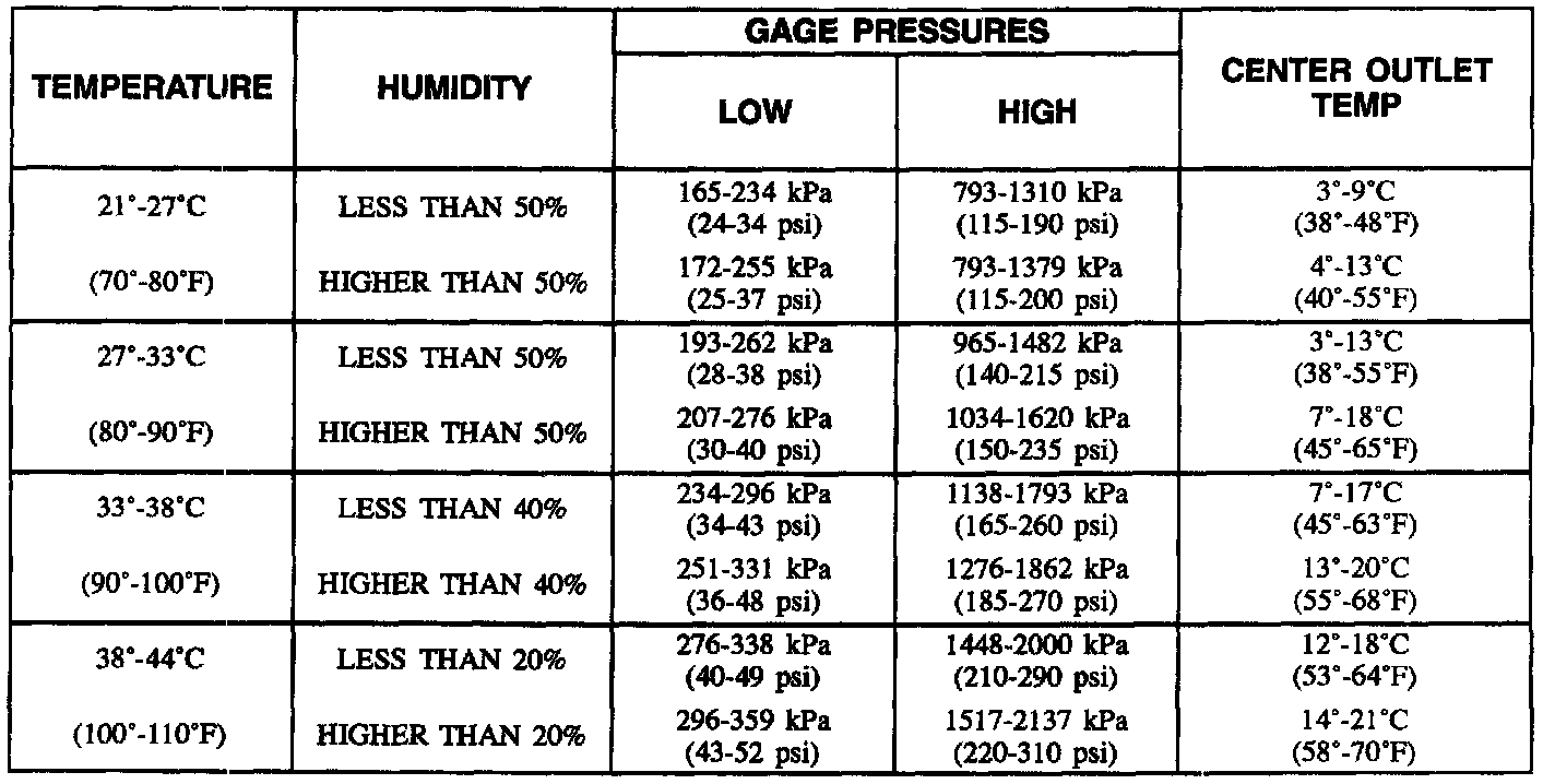 Performance testing provides a measure of air conditioning system operating efficiency by measuring and comparing pressures at the high-pressure and low-pressure sides of the refrigeration system, the temperature of the air being discharged into the passenger compartment, and the evaporator temperature.